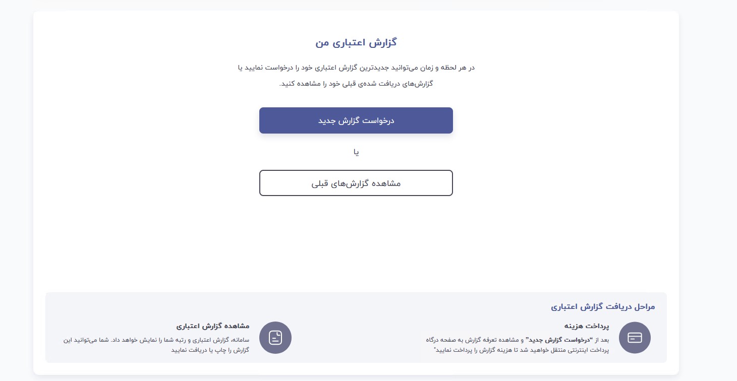 پس از ورود به سامانه اعتباریتو ، بر روی درخواست گزارش جدید کلیک کرده، تا به مرحله دریافت گزارش هدایت شوید.