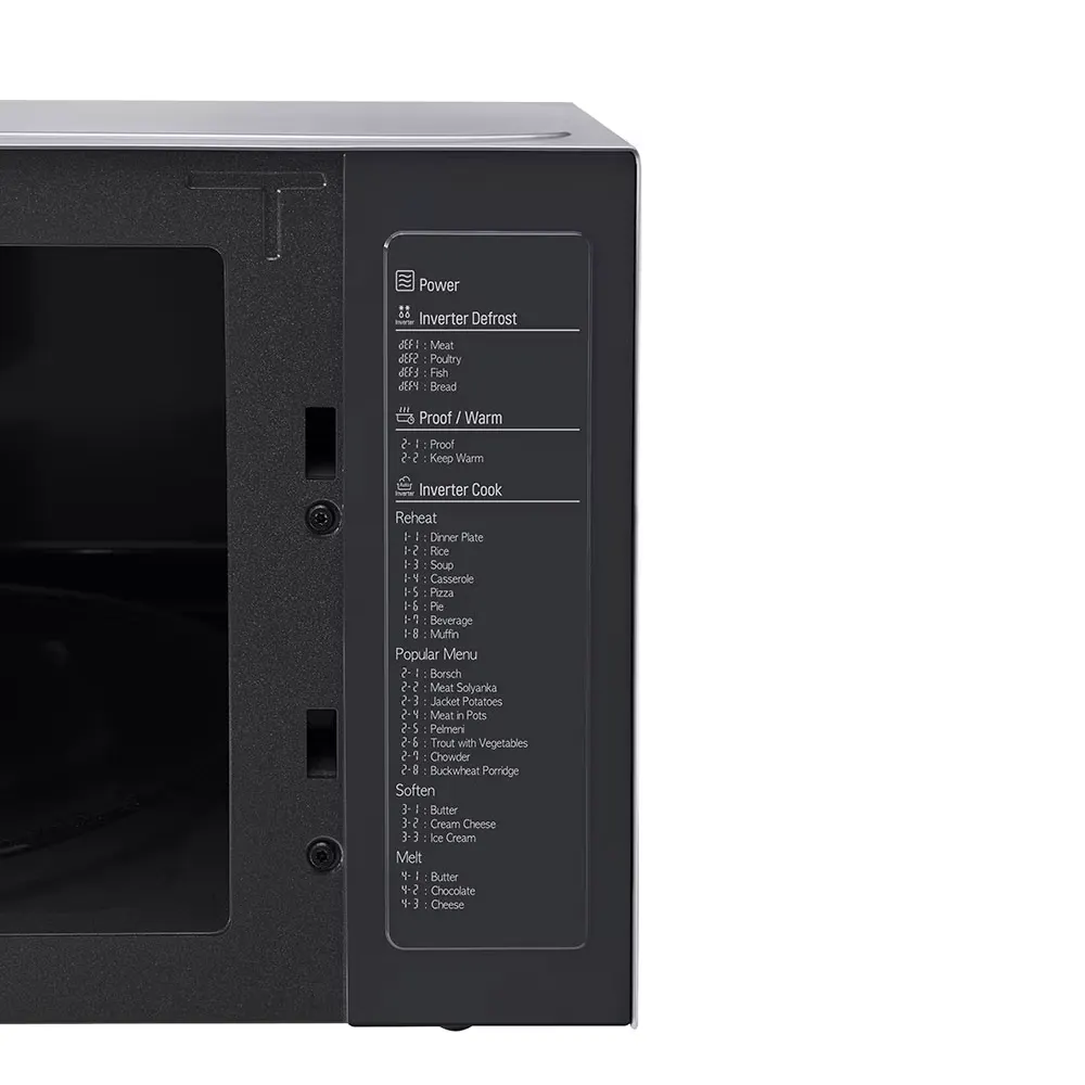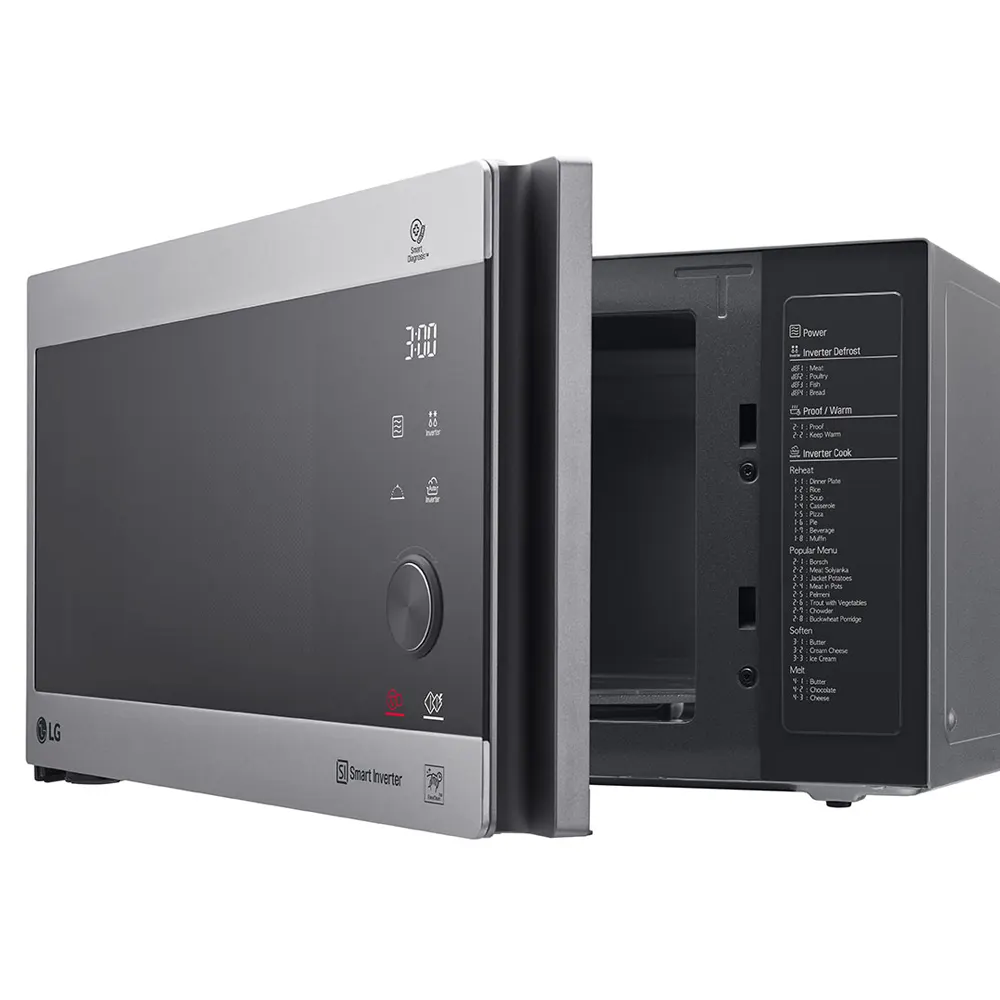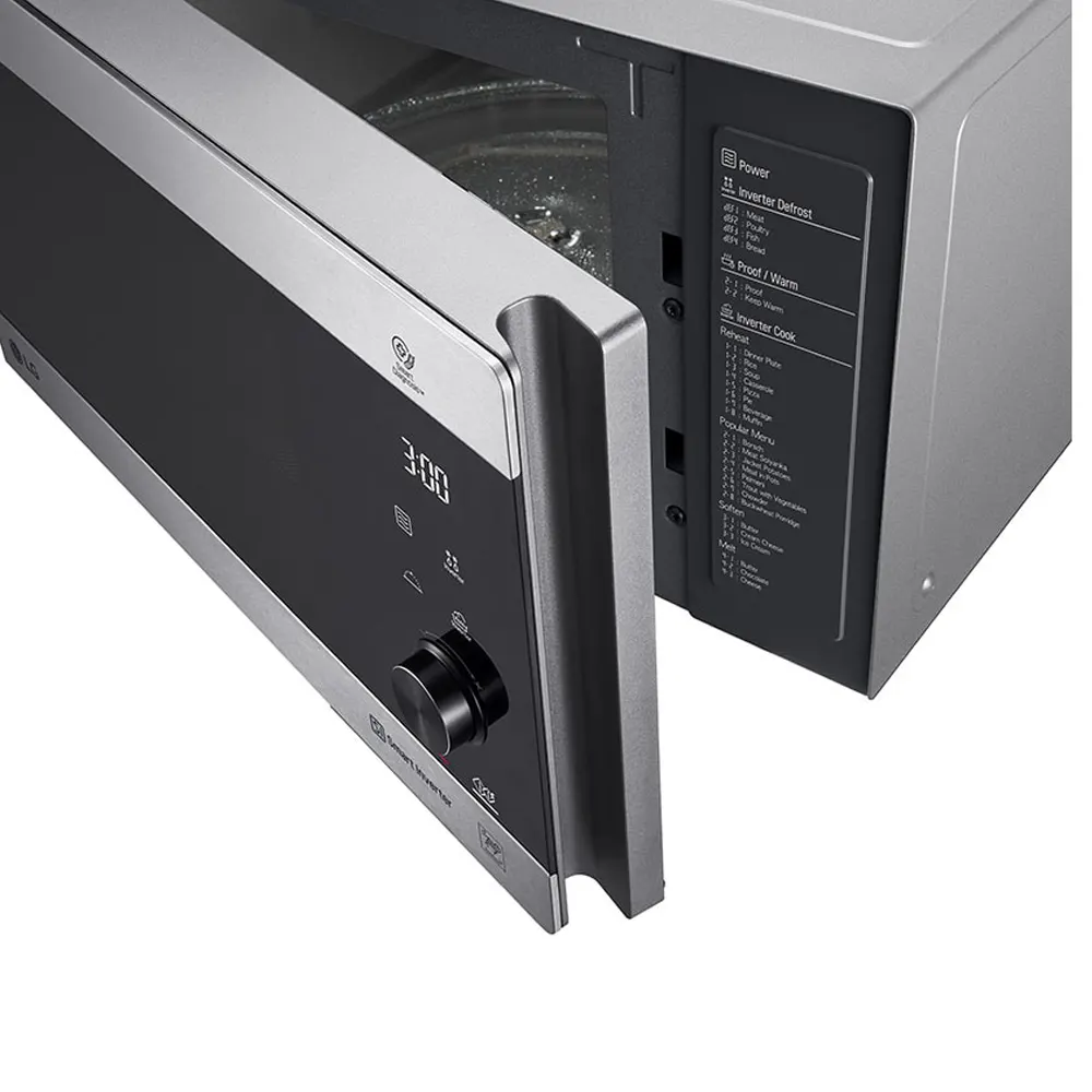 2 برنامه گرم نگه داشتن غذا (Proof & Warm) ,4 برنامه یخ زدایی با تکنولوژی اینورتر (Inverter Defrost) ,6 برنامه یخ زدایی آرام (Soften/Melt) ,8 برنامه پخت دقیق (Sensor Cook) ,8 برنامه گرم کن مجدد غذا (Reheat) ,دارای سیستم راه اندازی سریع (Quick Start) ,درب شیشه ای دودی رنگ ,دکمه های پنل لمسی شیشه ای ,روشنایی بیشتر تا 3برابر داخل دستگاه به کمک لامپ های LED ,سینی جدید پایدارتر با 6 چرخ گردان و حداکثر وزن قابل تحمل 2 کیلوگرم ,قابلیت حفظ طعم غذا (Tastesaver) ,گرمادهی یکنواخت با تکنولوژی Smart Inverter ,محفظه داخلی پوشش داخلی ضد باکتری از جنس ZIOLIT با قابلیت تمیز کردن آسان |