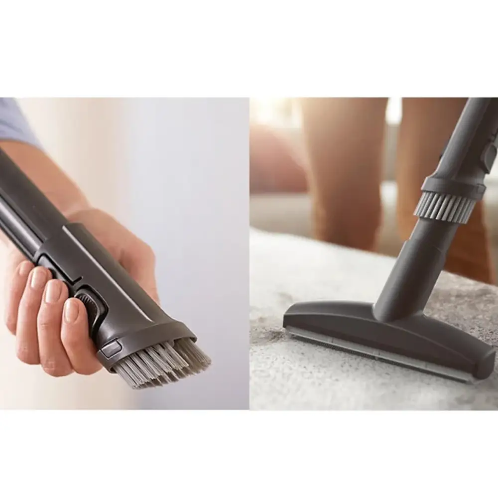 جنس بدنه از پلاستیک فشرده ,دارای دریچه ایمنی کیسه ,دارای سیستم کنترل مکانیکی بر روی بدنه دستگاه ,دارای کنترل از راه دور بدون خم شدن، با فناوری بی سیم IR ,فناوری Airflow Max برای به حداکثر رساندن جریان هوا و بالاترین قدرت مکش حتی با پر شدن کیسه ,قابلیت تنظیم قدرت مکش به کمک دکمه چرخشی روی بدنه ,قابلیت چرخش ۳۶۰ درجه لوله خرطومی ,لوله تلسکوپی فلزی ۲ قسمتی ,مجهز به نازل سوپر پارکت برای از بین بردن ۳ برابر بیشتر کثیفی های چسپنده ,نازل اصلی مدل +TriActive با قابلیت تنظیم در ۲ حالت برای تمیز کردن سطوح صاف و کف زمین |